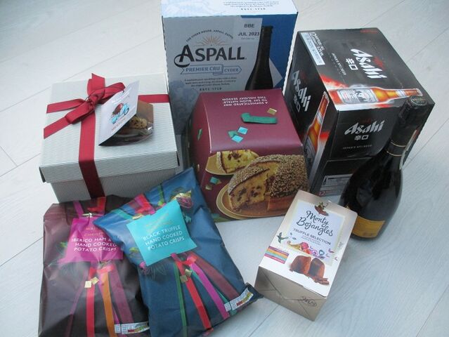 これが、夫が今日、買ってきたものの一部です。右上から時計回りに、「アサヒスーパードライ」「シャンパン」「ボックスチョコレート」「クリスマス限定のポテトチップ」「ヘストン・ ブルメンタールのパネトーネ」「ティラミス味のパネトーネ」「シードル(ASPALL)」です。