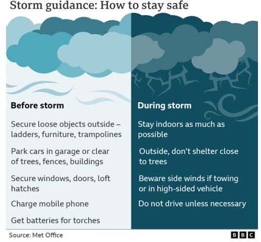 「Met Office」(日本の気象庁に相当)が出しているガイダンスです。「トランポリンを片付けるように」と書いてあるのが、なかなかイギリスらしいかも。トランポリンは、子供のいる家庭では、ほぼデフォルトかも知れません。