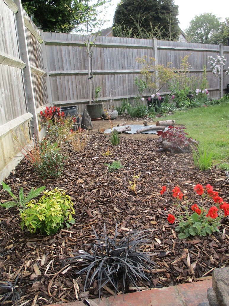 バックガーデンのこのエリアは、もともとはただの芝生だったのですが、昨年春に、夫が重い腰を上げて庭造りを始めました。