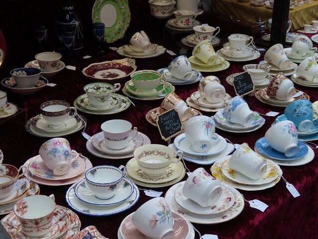 陶器類は、こんな感じです。ティーカップ+ソーサー+皿のワンセットで10ポンド~20ポンド(約3300円)ぐらいのモノが多かったです。