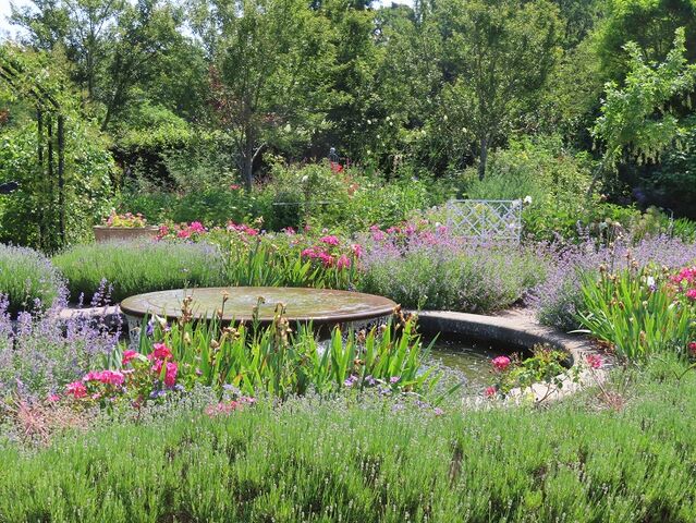 コテージガーデンの真ん中には、噴水エリアがあり、くつろげるように、噴水の周囲にベンチもあります